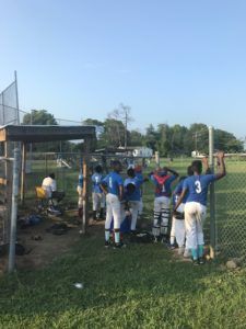 When we arrive at the ballpark, several additional boys meet us and they head for the home “dugout.” There is awood bench with a tin roof separated from the field and the bleachers by a recycled chain-link fence. Almost as soon as the boys sit on the bench, they suddenly vacate the dugout shouting about wasps. There is a wasps’ nest under the wood bench, which one brave player dispatches with the handle of his bat. Phil calls the boys to the field and before warming up they gather on the infield in a huddle as Phil leads them in prayer.