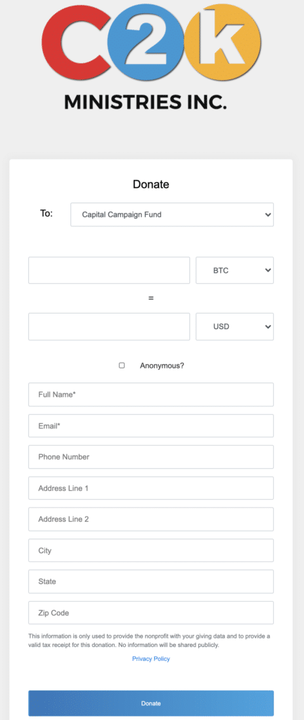 Just click the form below to be directed to our online platform for digital currency gifts. All transactions are secure and encrypted.